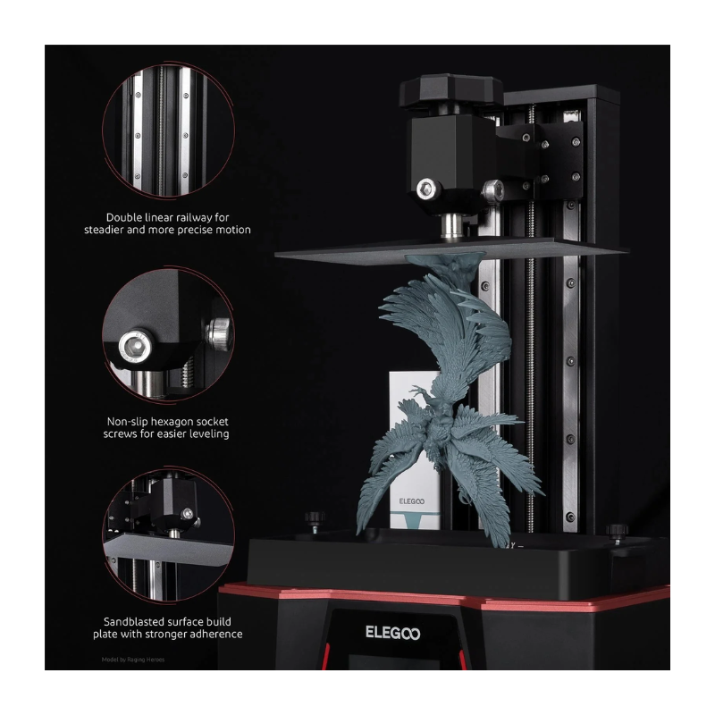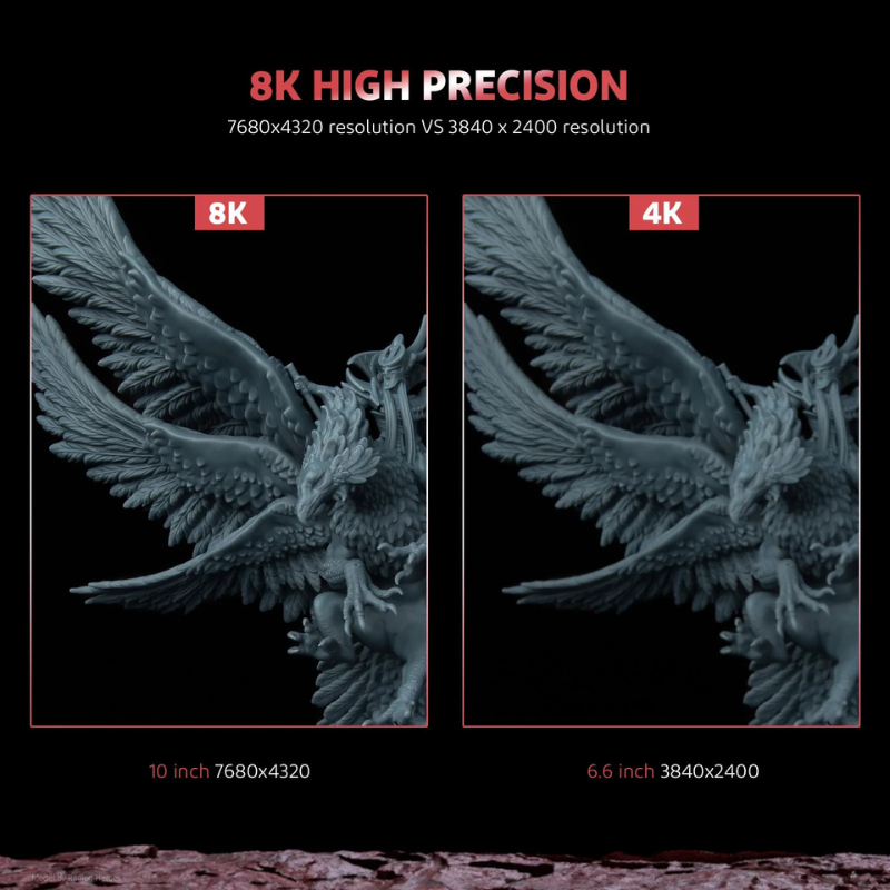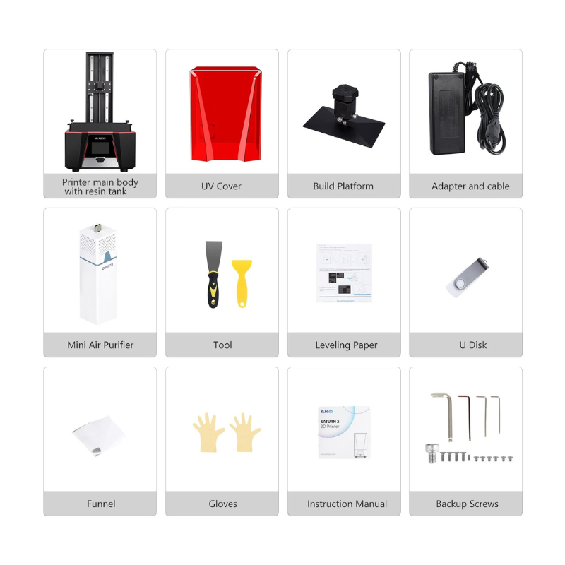 - ELEGOO Saturn 2 adopts a 10-inch 8K mono LCD screen with an HD resolution of 7680×4320 and an ultra-fine XY resolution of 28.5 microns, outputting outstandingly detailed 3D models with a cure time of only 1-3s per layer. The scratch-resistant tempered glass above the LCD screen with 9H hardness for better light transmission and protection.